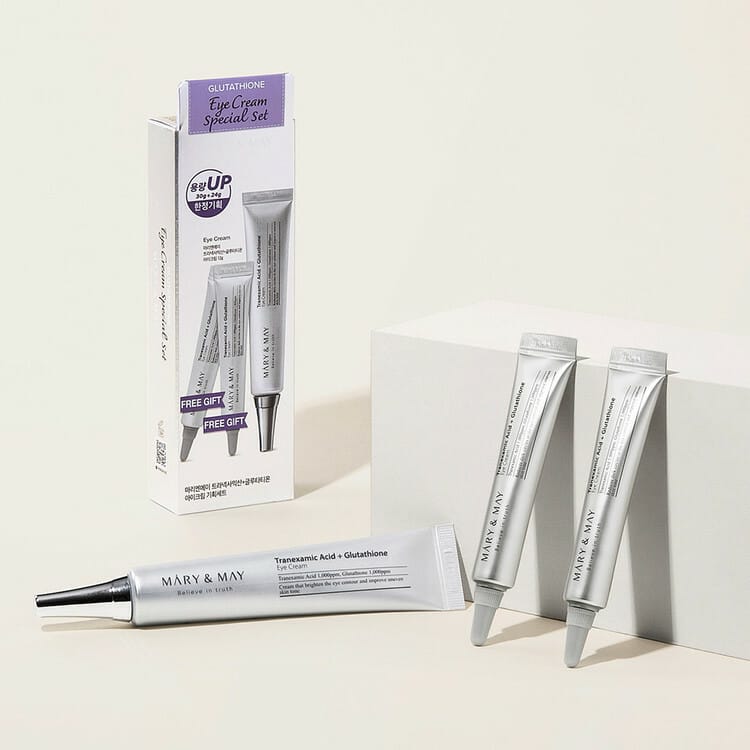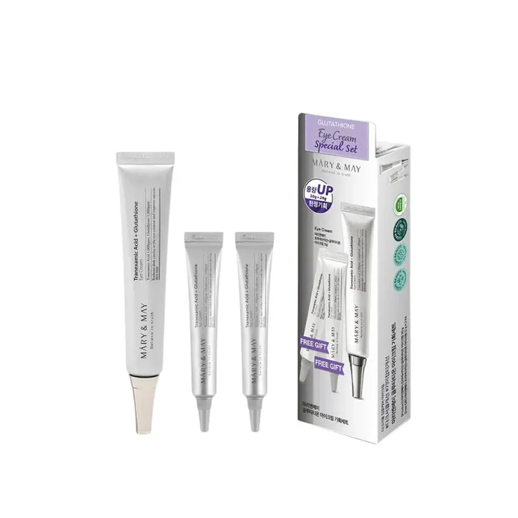 دلّلي منطقة العين الحساسة مع مجموعة Mary&May Tranexamic Acid + Glutathione Eye Cream Special Set.